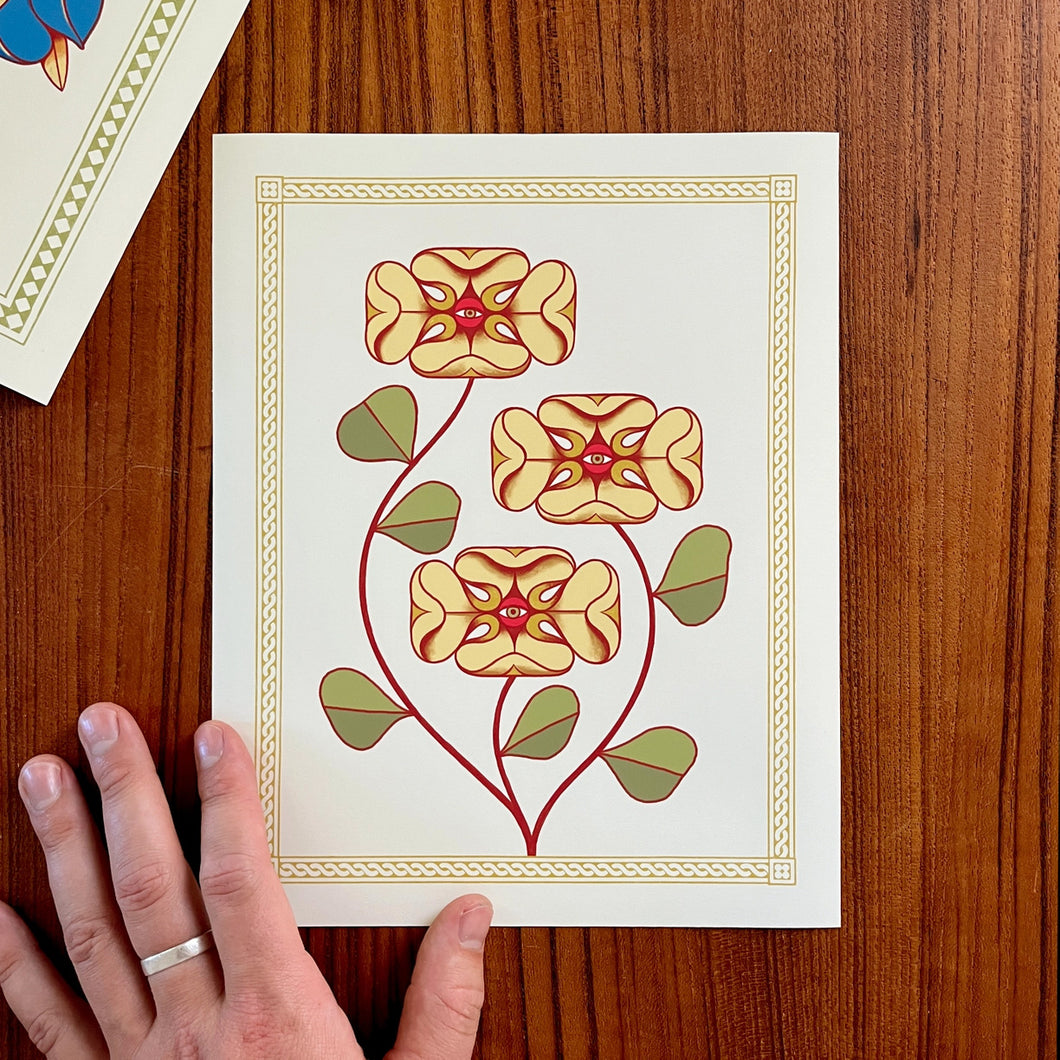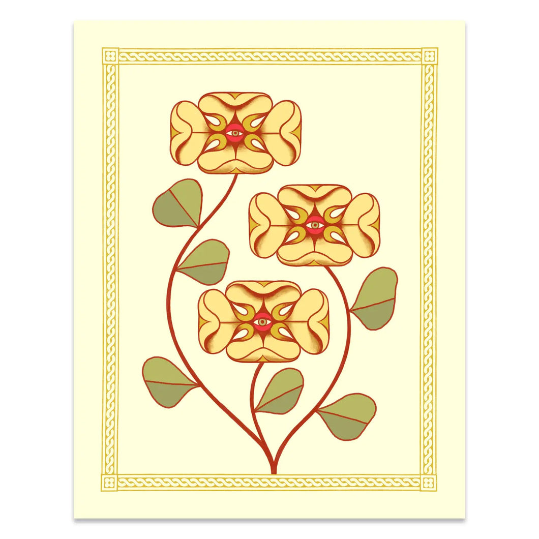 A mystical botanical print designed and inkjet printed in studio on archival and acid-free paper. This print is 11 x 14" and is packaged with a backing board in a cellophane sleeve. This design was human made, not AI generated!