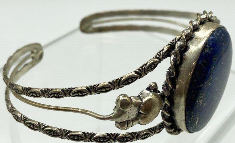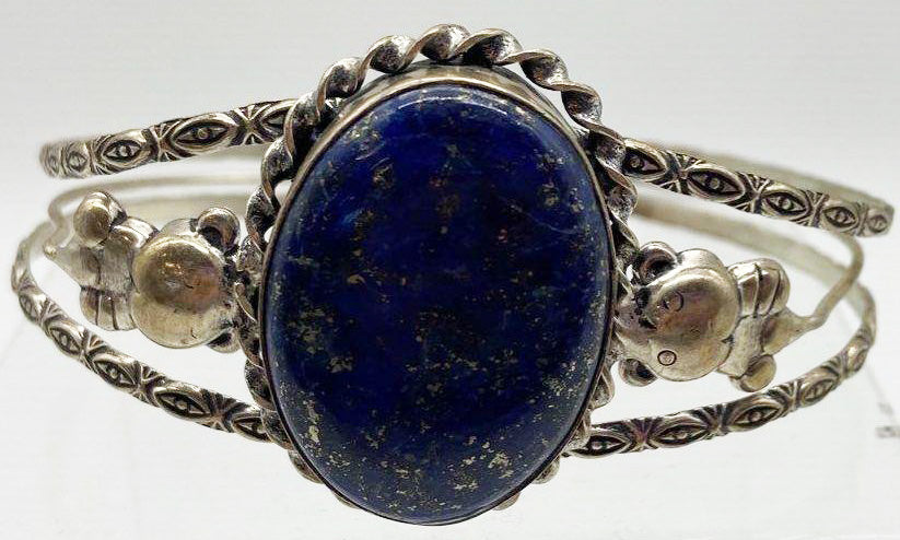 Vintage lapis cuff bracelet with little mice or something on the sides.