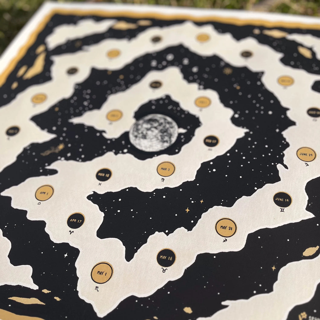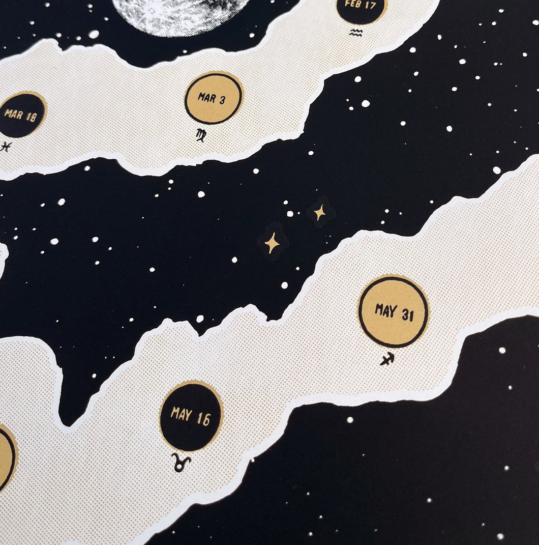 This calendar is 20 x 20", and is screen-printed by me + many beloveds (as I am injured) in two colors, charcoal grey black and rich champagne gold, on heavyweight cream paper.