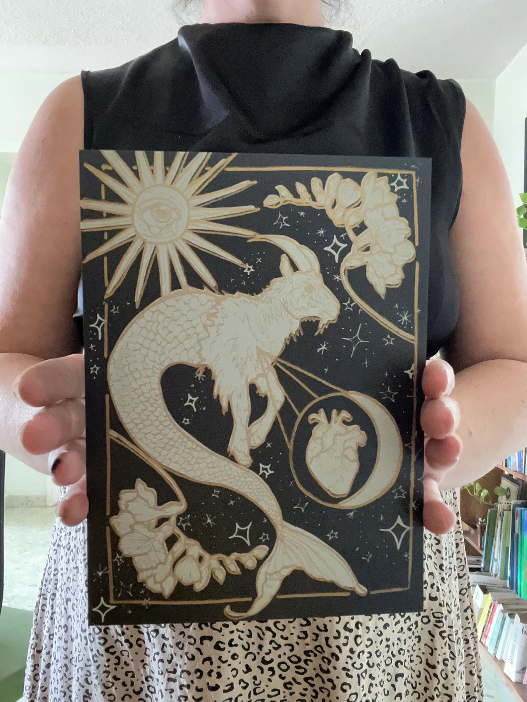 This is a 2 color, hand drawn, and hand pulled silkscreen postcard. It is 5x8"