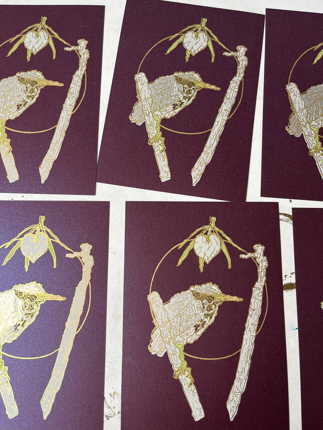 These are 6 colored hand drawn transparencies, hand pulled silkscreen prints. They are on Stardream cardstock.